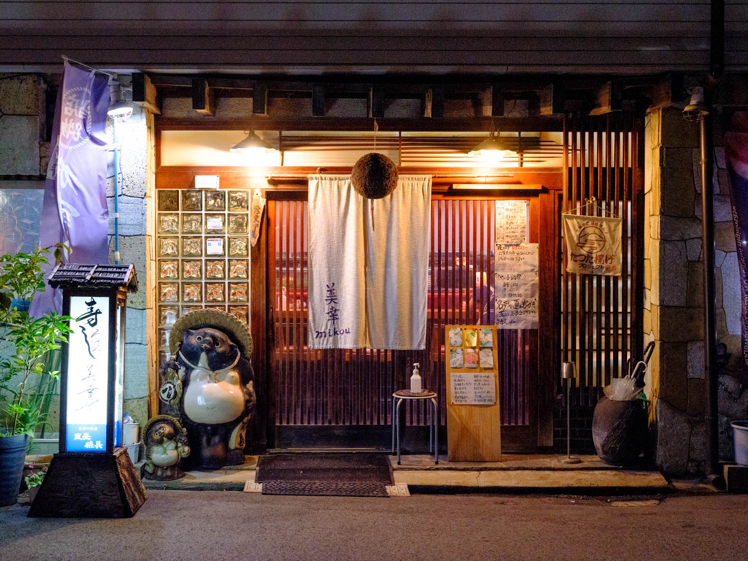 「味を足したり変えたりするのではなく、そのものの良さを味わってほしい」と語るのは、寿司の老舗「美幸」の大将・荻原佐久雄さん。長年の経験で食材を目利きし、その日一番と思えるものを仕入れ、寿司をはじめ多彩な料理を提供しています。近鉄生駒駅側から参道筋を少し上り、東の通りに目をやると現れる信楽焼のたぬきが、美幸の目印です。