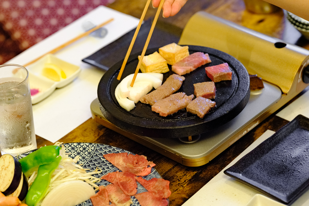 村さわ家で使うのは鉄板ではなく溶岩プレート。高温になるのに直火と比べて焦げにくく、遠赤外線効果で食材がしっとりと焼き上がります。程よく脂も吸うので、焼肉にうってつけ。手入れにはコツがいりますが、その手間をかけてでも「肉の良さを生かすならこれ」なのだそう。