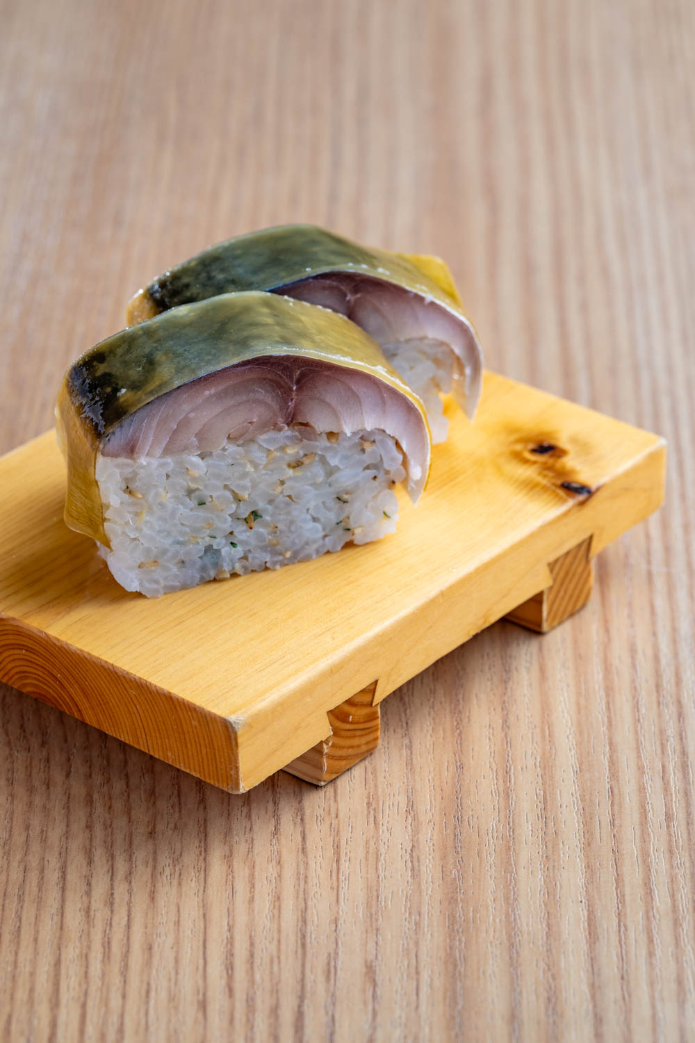 伊勢志摩を中心に、各地から仕入れる新鮮な海の幸も人気があります。その中でも、店長の福岡正志さんが「蕎麦と一緒に、ぜひ召し上がっていただきたい」と強く推しているのが「鯖棒寿し」です。新鮮な国産サバを店内で酢締め。ガリ、ごま、大葉を混ぜ込んだシャリと合わせてあります。