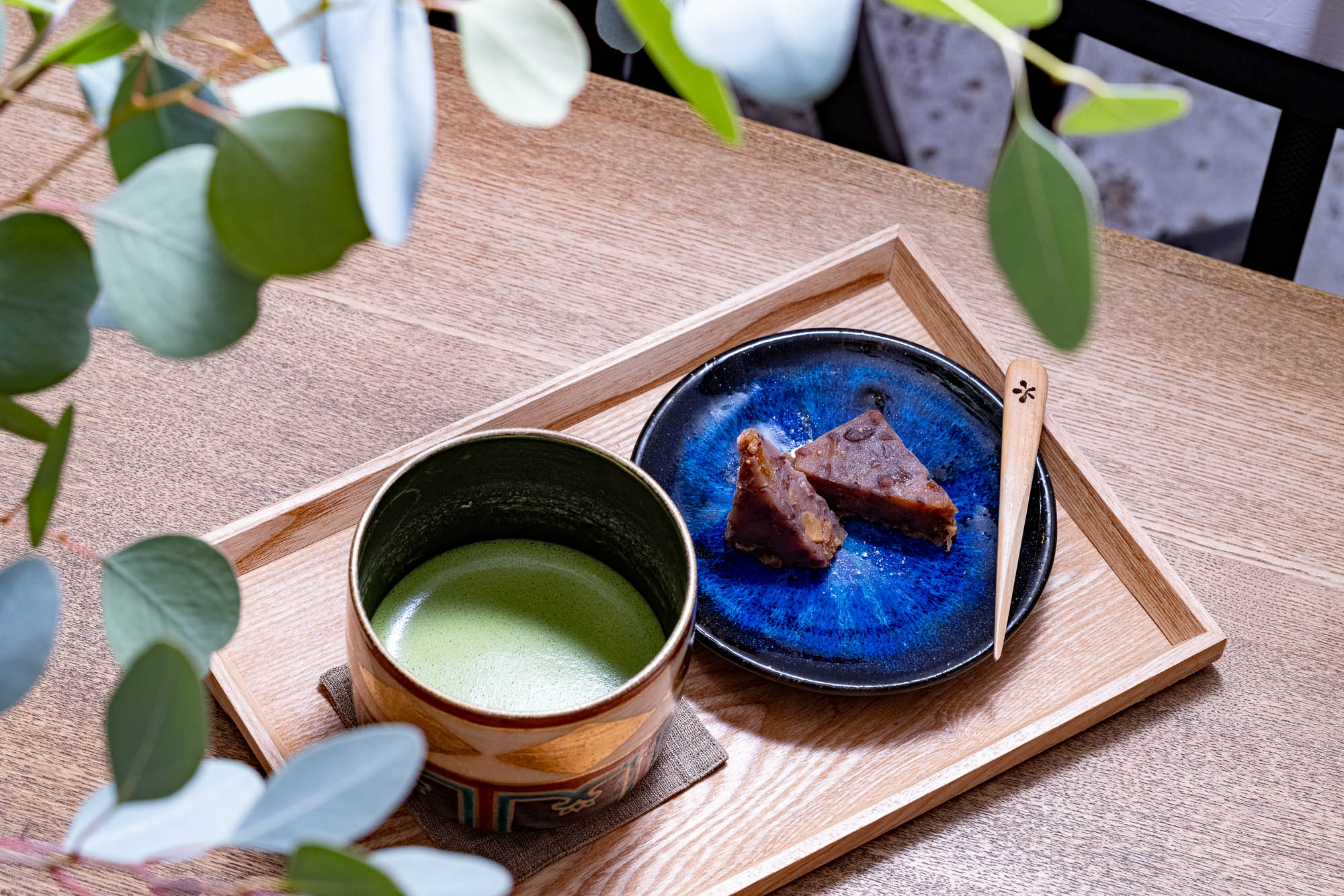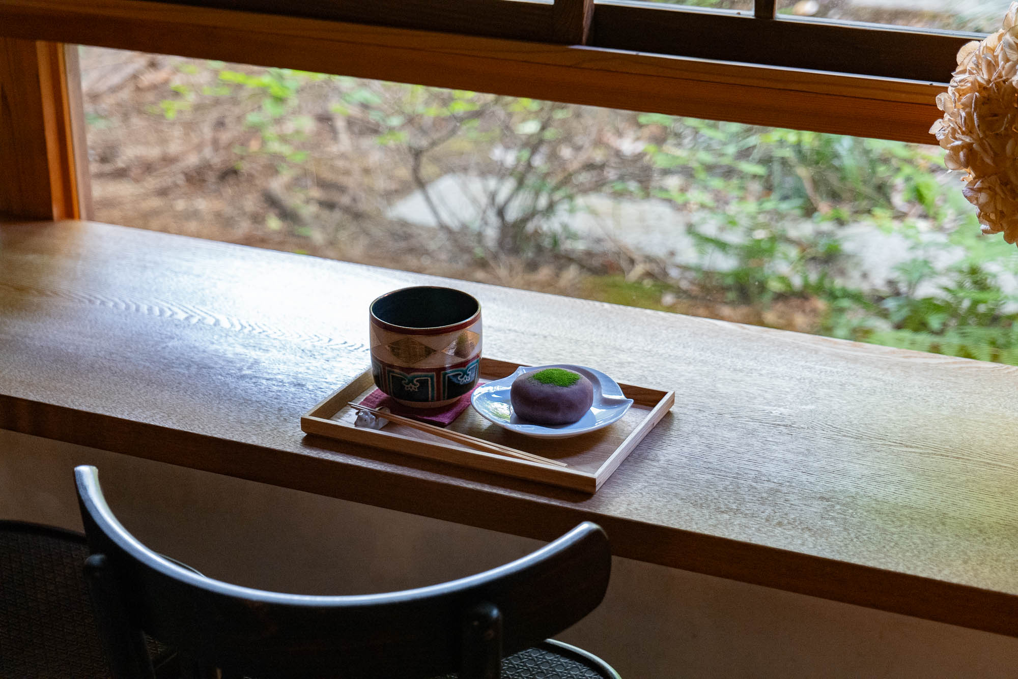 その日の気分で選んだ和菓子とお茶を、お庭の景色に癒されながらいただきます。