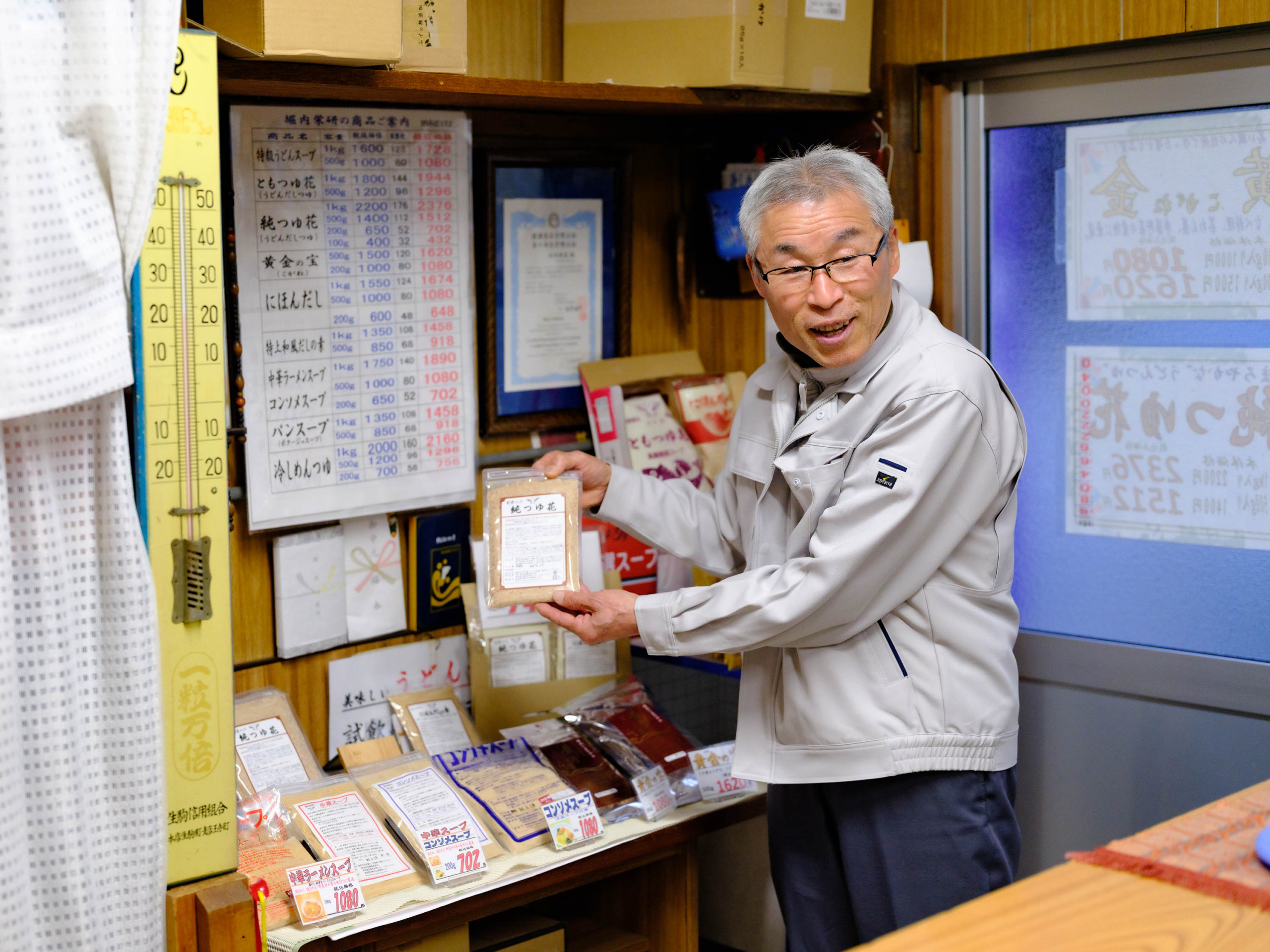 この場所にお店を出し始めたのが、先代である堀内さんのお父様。昭和30年代にパンスープを開発して、公設市場で販売するようになりました。しかし、ハイカラで西洋的な味のパンスープは一般家庭に受け入れられるのに時間がかかったのだそう。やっと時代が西洋風のスープを受け入れ始めると、大手メーカーがこぞってパンスープという商品を手掛けるようになりました。結果、競合が増え堀内栄養食研究社の売り上げも芳しく無くなります。そこで、思い切って事業を転換。世間でも少しずつ認められ始めた「うどんスープ」を手掛けることにされたそうです。