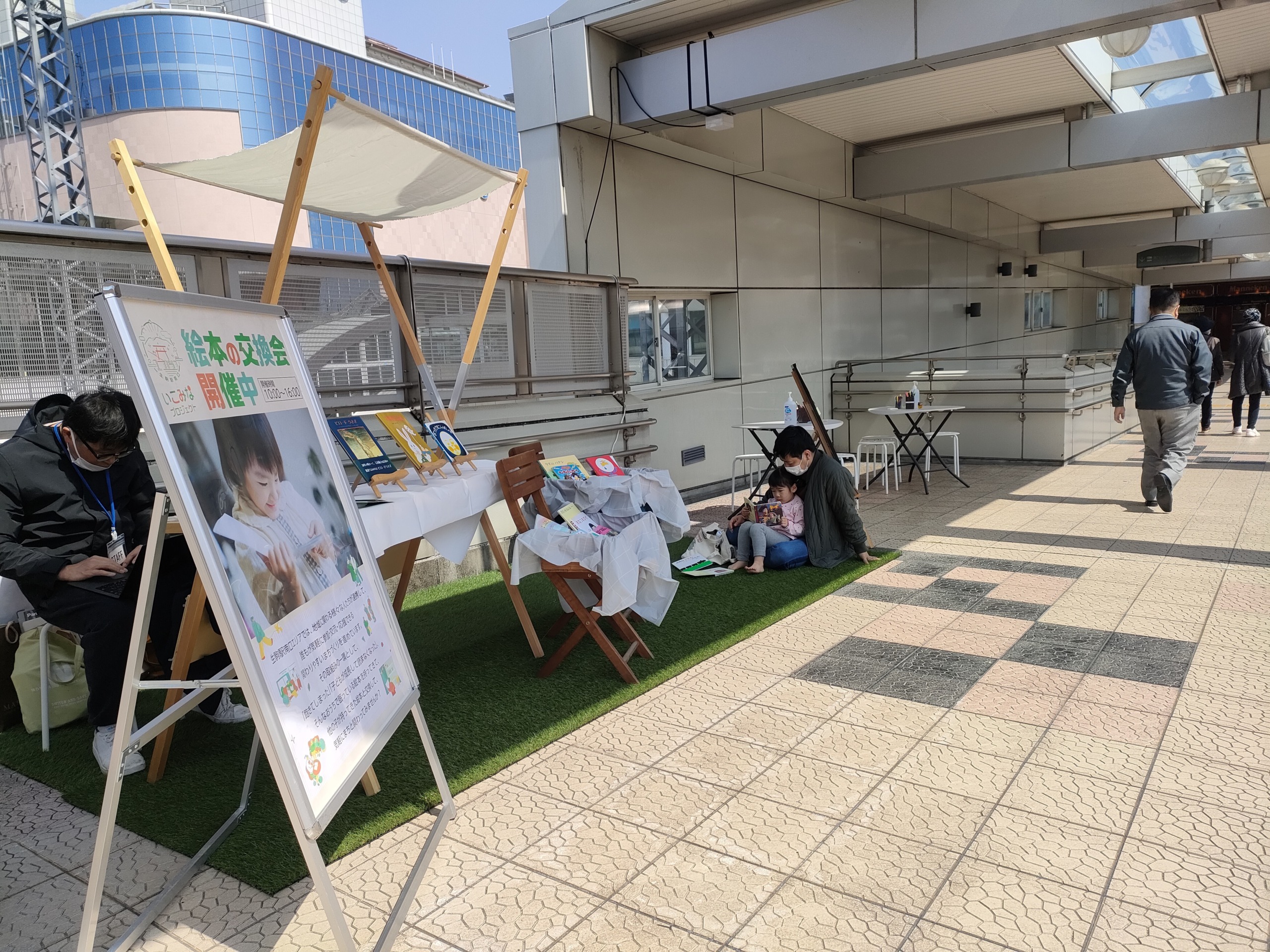 子育て世帯へ生駒駅南口みらいビジョンをPRするため、2024年3月16日(土)に駅前のペデストリアンデッキを活用し、絵本の交換会などを開催しました。