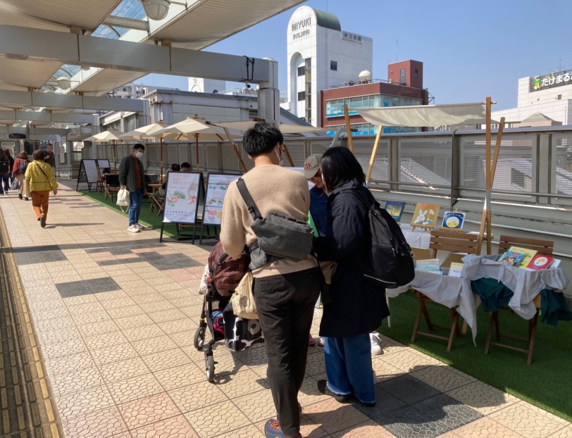 子育て世帯へ生駒駅南口みらいビジョンをPRするため、2024年3月16日(土)に駅前のペデストリアンデッキを活用し、絵本の交換会などを開催しました。